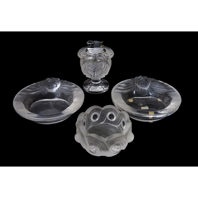 'Tete de Lion' a modern Lalique clear and frosted glass table lighter and two cendrier