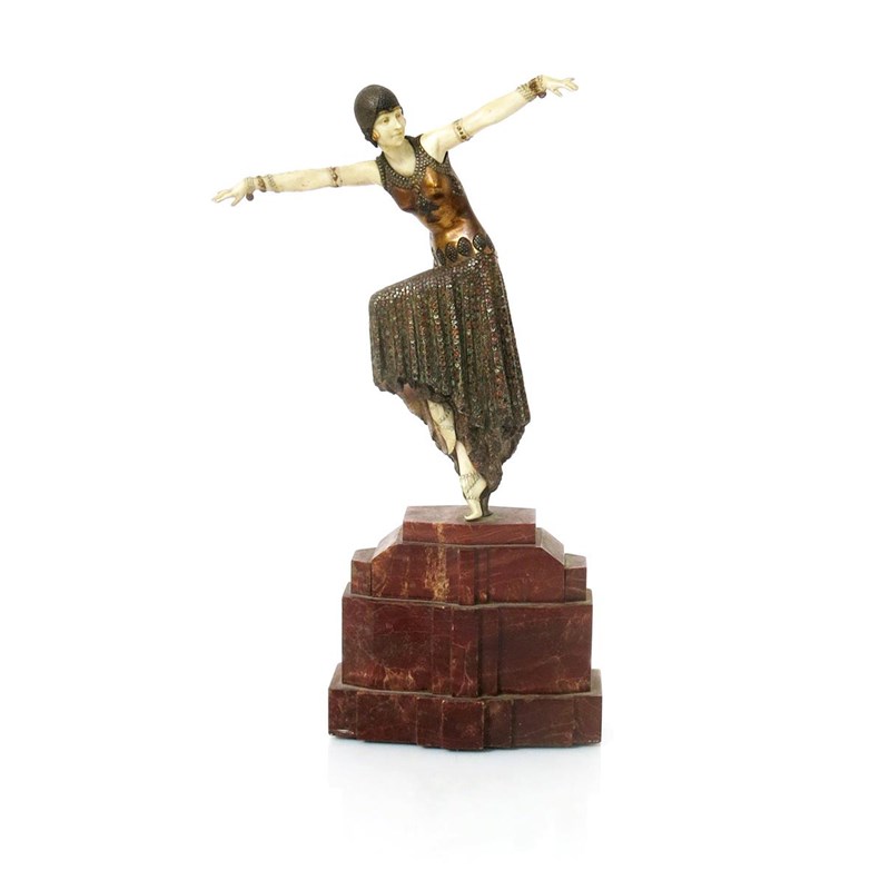 λ Shimmer a bronze and ivory figure cast and carved from a model by Demetre Chiparus, on stepped red veined marble base, unsigned, two toes chipped off, minor chips to base, 38cm. high