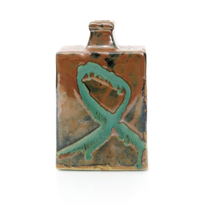 a slab built stoneware bottle, with tapering neck, covered with a rich tenmoku glaze and simple green brush design unsigned 20cm. high
