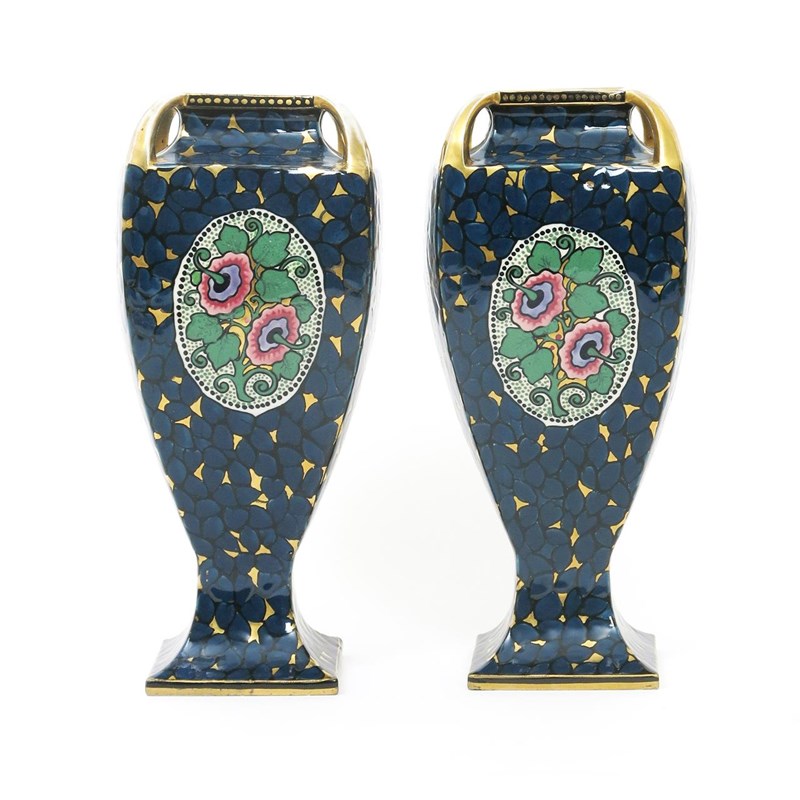 A pair of Ernst Wahliss pottery vases, model no.9979, urn shaped, square section printed and painted with stylised floral panels, in colours on a blue foliate ground, highlighted in gilt, printed and incised marks, professional restoration to bases, 33cm. high, (2)