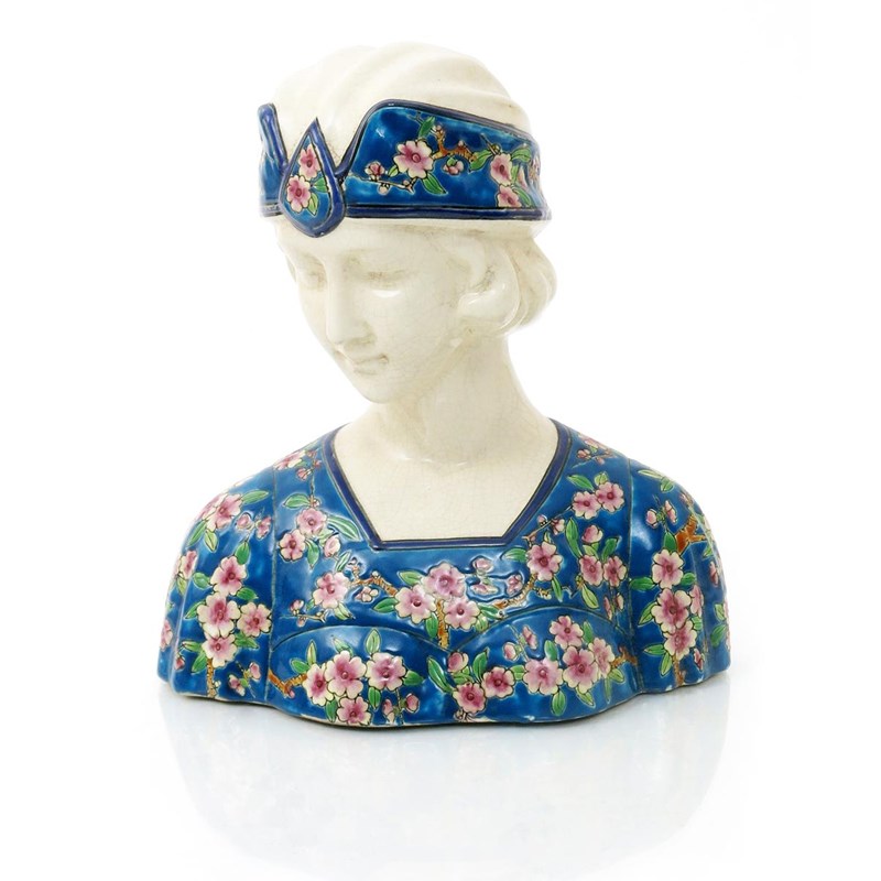 An unusual Longwy pottery bust of a woman, modelled with downcast look, wearing floral headband and dress enamelled in pink, green, orange and blue on a cream ground stamped marks to base, Les Bleus de Louviere, 27cm. high
