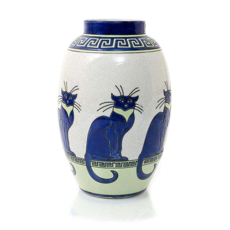 A Keralouve La Louviere vase, shouldered, cylindrical form, enamelled with a frieze of blue comical cats below a band of Greek Key decoration, enamelled in shades of blue, pale green and black on a crackled white ground, printed factory marks, 28.5cm. high