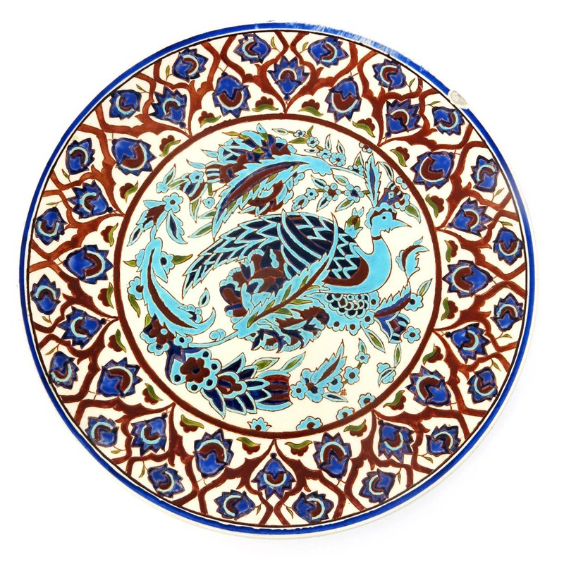 An Iznik style wall charger probably by Boch Freres Keramis, enamelled to the well with a stylised bird in a bough, the rim with stylised flowers, in shades of blue, turquoise, green and rust on a cream ground, impressed Schultz, chip to rim, 38cm. diam.