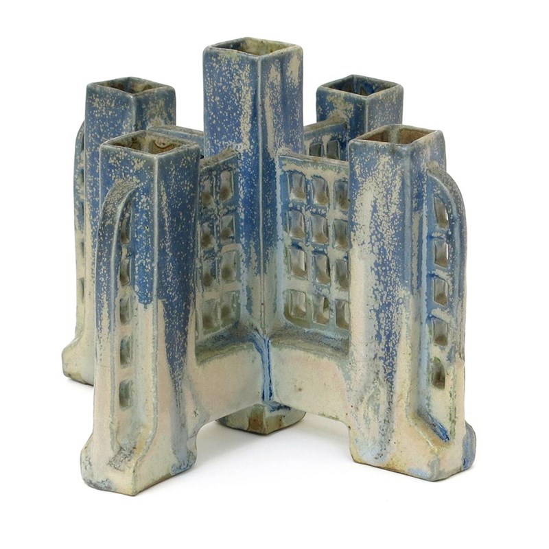 A Charles Greber ceramic bud vase, five square section vase stems on cruciform base with trellis panels, glazed blue graduating to cream partially concealed signature to base, 16cm. high