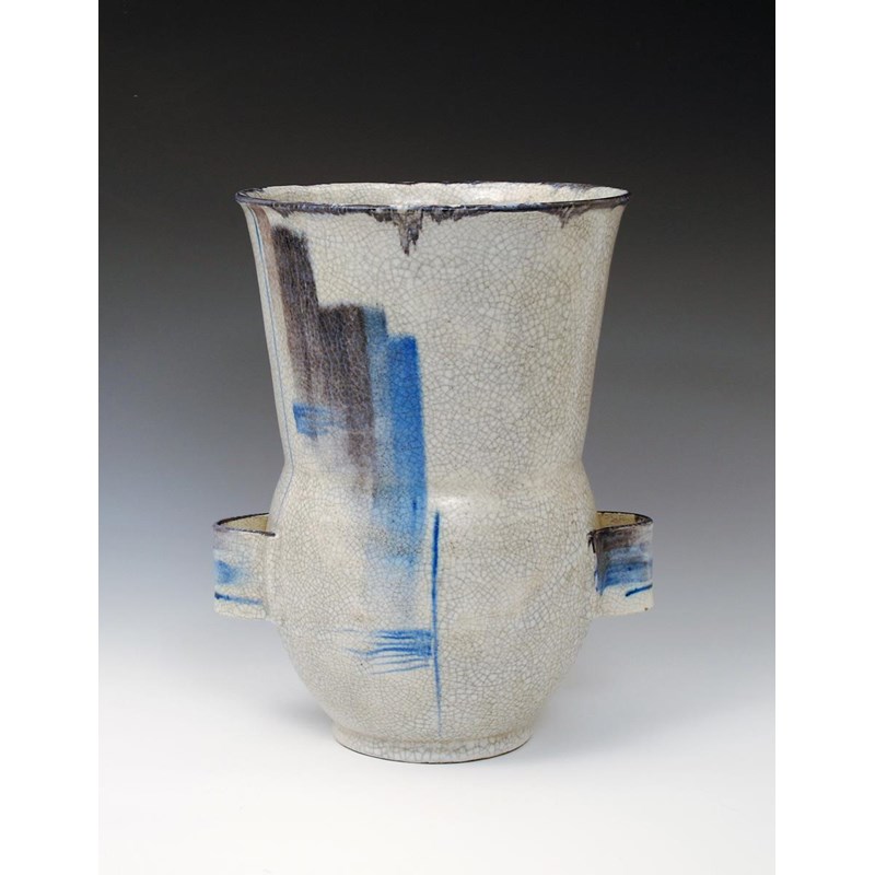 A Bauhaus Hamelner Topferei vase designed by Gertrud Kraut and painted design by Anni Rawitzer, the ovoid body with tall flaring neck, applied with two strap handles, painted with a geometric design in blue and ochre on a crackled cream ground impressed mark to base, chips to foot rim, 40cm. high