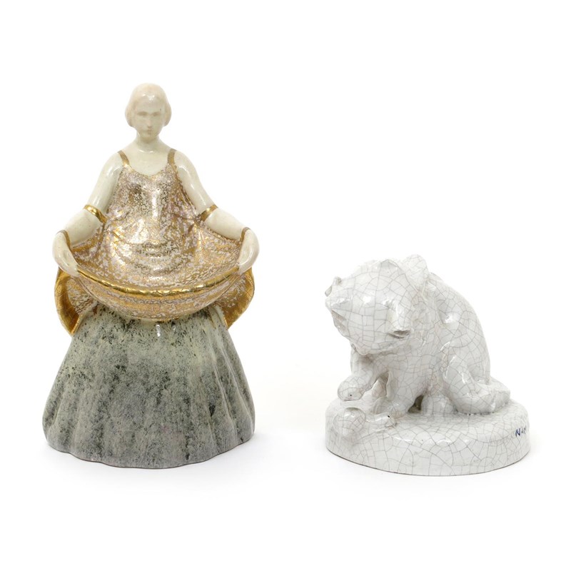 An Art Deco Boulogne sur Seine pottery figure of a lady designed by Andre Fau and Marcel Guillard, modelled in a long flowing dress, glazed silver-grey highlighted in gilt, and a crackled glaze pottery model of a cat playing with a snail by Jacques Nam, impressed marks, professionally restored neck, 32cm. high (2)