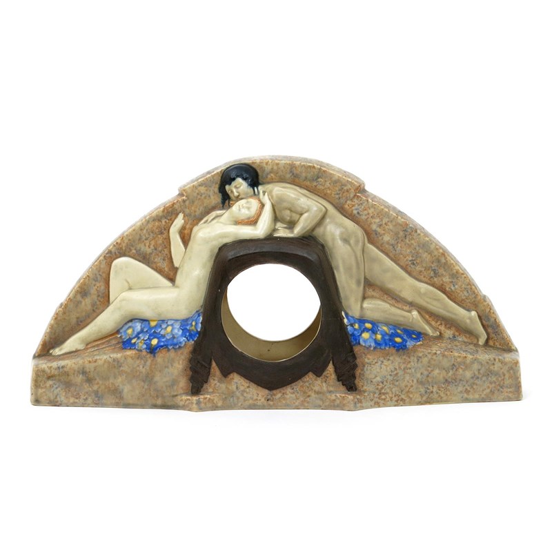 An Art Deco D'Argyl ceramic mantel clock case, the domed, rectangular form cast in low relief with lovers embracing, painted in colours on a cream ground, painted signature to base, 53cm. wide.
