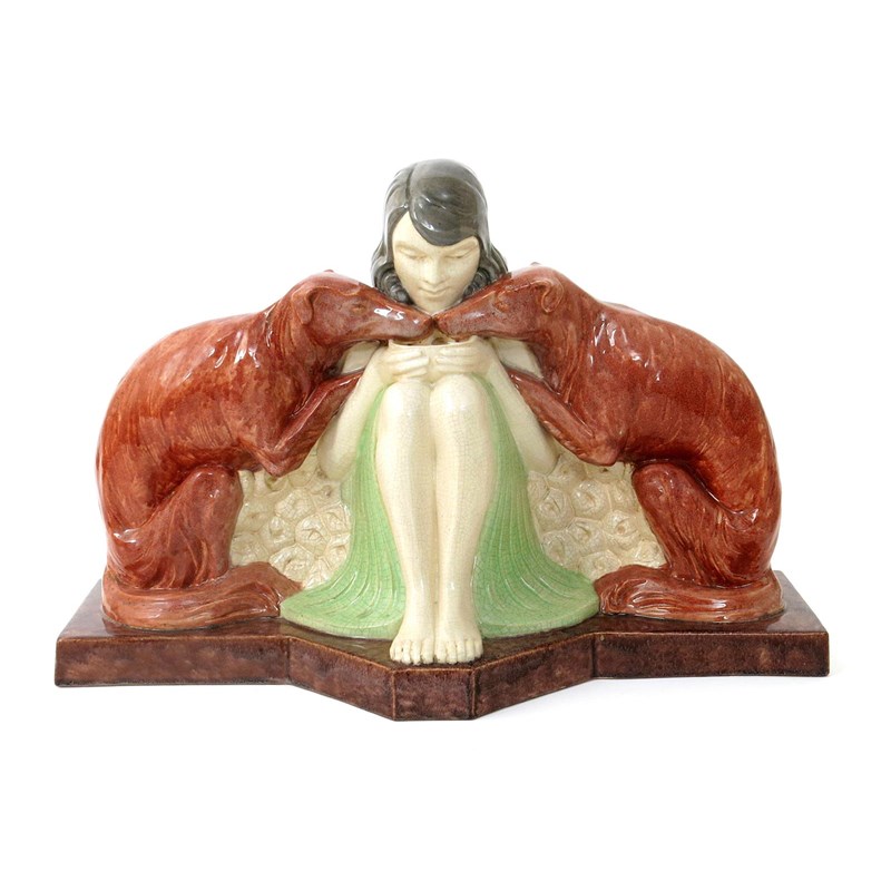 An Armand Godard pottery model of a girl and two borzoi cast from a model by Marcel Guillard