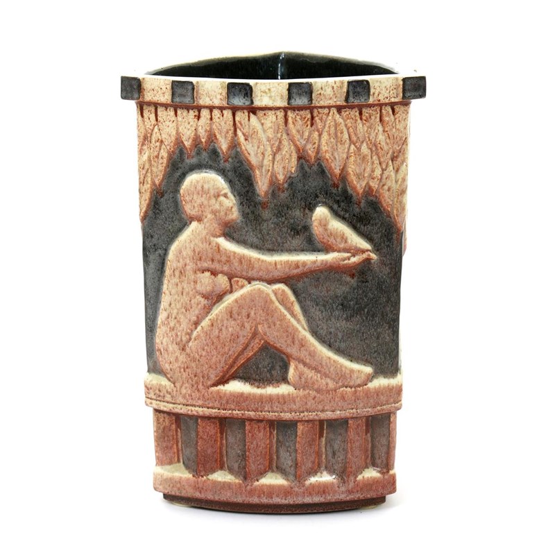 A Marcel Guillard Art Deco vase by L Rossat, triangular section, cast in low relief to each side with a nude maiden holding a bird in her hand, in a formal garden setting, glazed mottled ochre and red on a buff ground impressed marks and facsimile signature 26cm. high