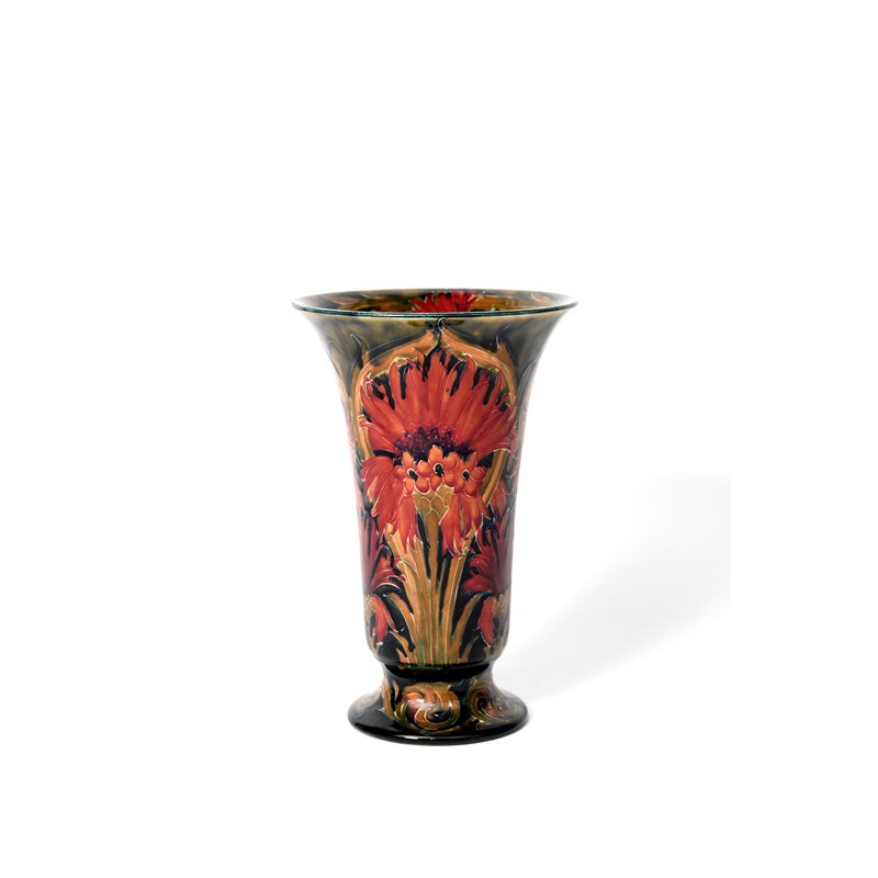 'Brown Chrysanthemum' a Moorcroft Pottery vase designed by William Moorcroft, footed form, tubeline decorated in shades of red, blue and green, painted green signature, hairline to top rim, 23.5cm. high