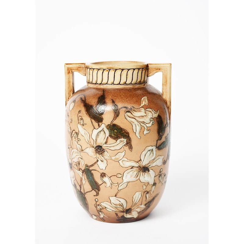 A Martin Brothers stoneware vase by Robert Wallace Martin, dated 1887, twin-handled, shouldered cylindrical form, painted with white flowers and foliage, in white, green and ochre on a buff ground, incised 1-1887, R W Martin & Bros, London & Southall, 22cm. high