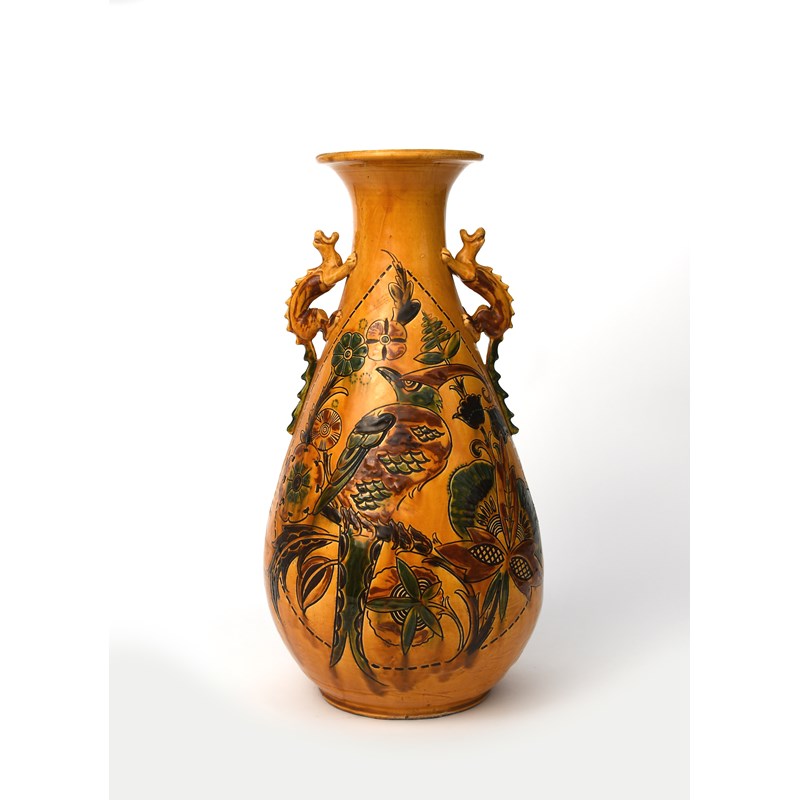 A large pottery Dragon vase probably Brannam, tapering cylindrical form with applied twin dragon handles, incised and painted with birds perched on a flowering branch in green and ochre on a yellow ground, unsigned, 49cm. high