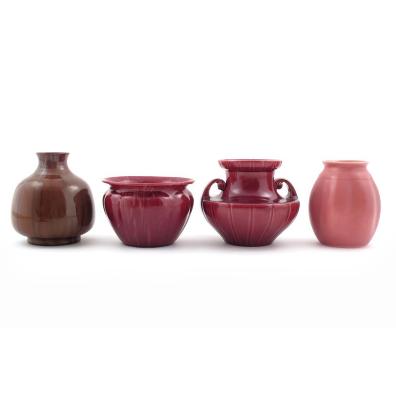 A Pilkington's Royal Lancastrian vase, shape no.2821, ribbed, shouldered form with applied scroll handles, covered in a ruby glaze, three other vases, a posy vase and a matt cream wall pocket impressed marks, 13cm. high
