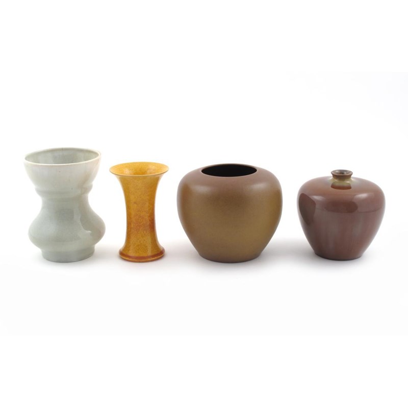 A Pilkington's Lancastrian vase, ovoid with everted narrow neck, covered in a finely streaked brown glaze, the neck golden, a shouldered vase by Robert Tunnicliffe covered in a matt brown glaze, another waisted vase and a orange streaked vase printed bee mark, impressed P 13cm. high