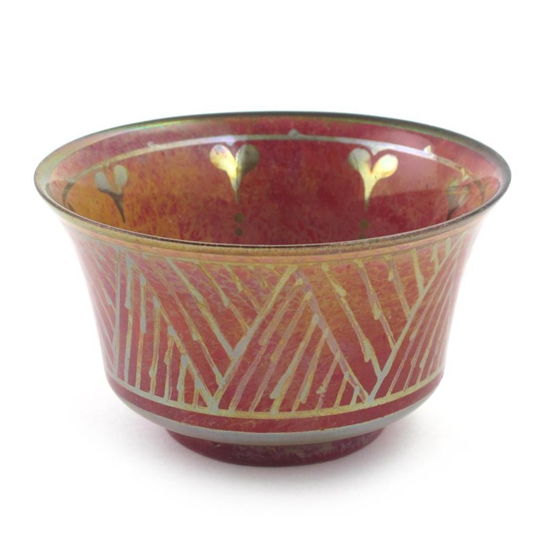 A Pilkington's Lancastrian bowl by Gwladys Rodgers, flaring form, painted in gold lustre with linear triangular design to the exterior, the interior with golden hearts on a mottled red and orange ground impressed mark, painted artist monogram 10.5cm. diam.