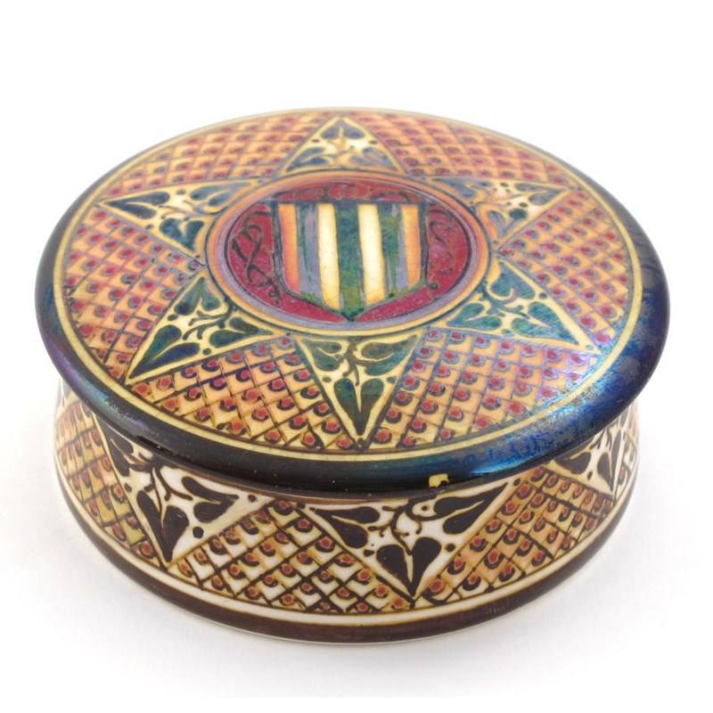 A small Pilkington Lancastrian box and cover by Gwladys Rodgers, dated 1907, circular form, painted to the cover with a heraldic shield, inside a border of foliage sprigs, in shades of ruby and gold lustre on a cream/yellow ground impressed marks and date mark, painted artist cypher, base restored 8cm. diam.
