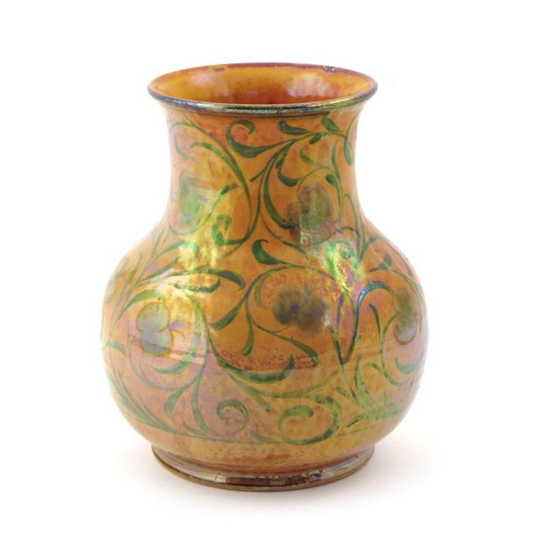 A Pilkington's Lancastrian vase by Gordon Forsyth, dated 1912, painted with pomegranate fruit sprays in green on a golden-yellow lustre ground impressed marks, painted artist cypher and dated 9th Jan 1912, 19.5cm. high