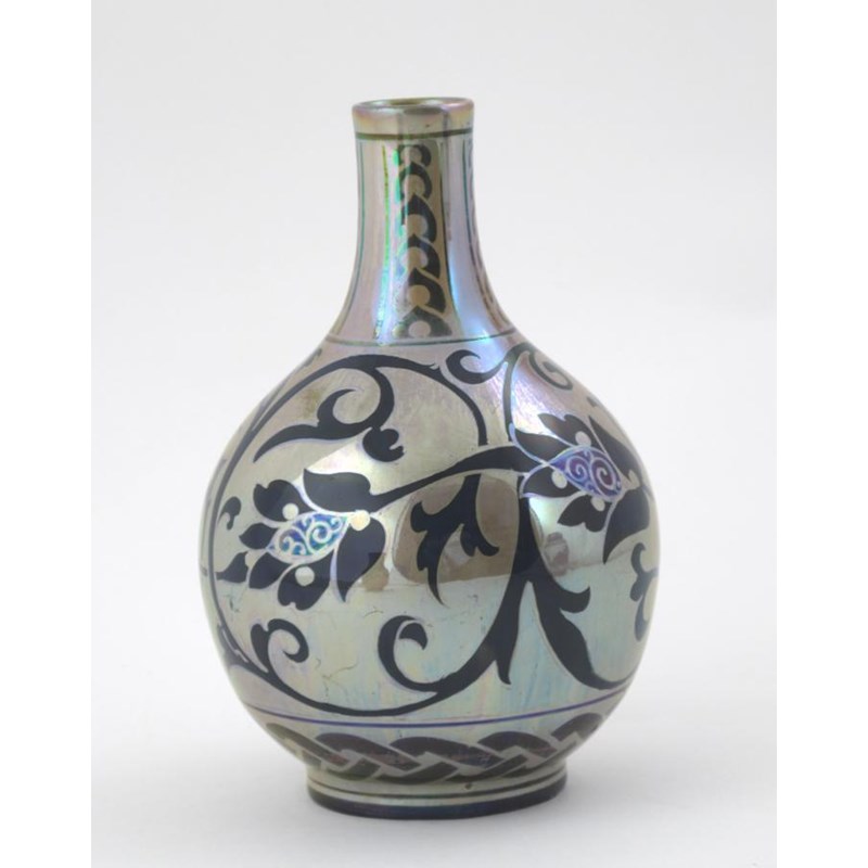 A Pilkington's Lancastrian vase by William S Mycock,  dated 1913, ovoid with cylindrical neck painted with flowers inside scrolling foliage borders in blue on a streaked silver ground impressed marks, painted artist cypher and datemark 19cm. high