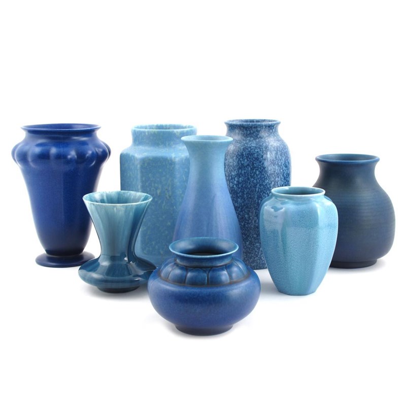 A tall Pilkington's Royal Lancastrian vase, shape no 2822, covered in a matt blue glaze, and seven other Pilkington's vases covered in various blue glazes various marks 24.5cm. high