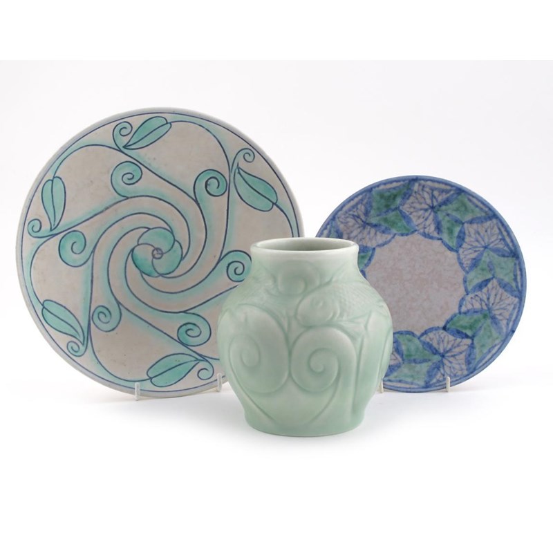 A Pilkington's Royal Lancastrian shallow bowl, by William S Mycock, dated 1936, incised with scrolling foliage sprays in turquoise and blue on a white ground, a vase shape no.3363 modelled in low relief with fish and a Lapis plate by Gwladys Rodgers impressed and incised marks, 26.5cm. diam.