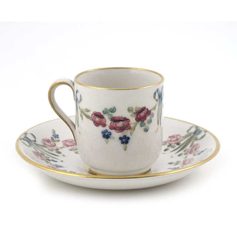 'Eighteenth Century' a James Macintyre & Co cup and saucer, designed by William Moorcroft, painted in shades of pink, blue and green on a white ground printed factory mark, painted green signature 8cm. high
