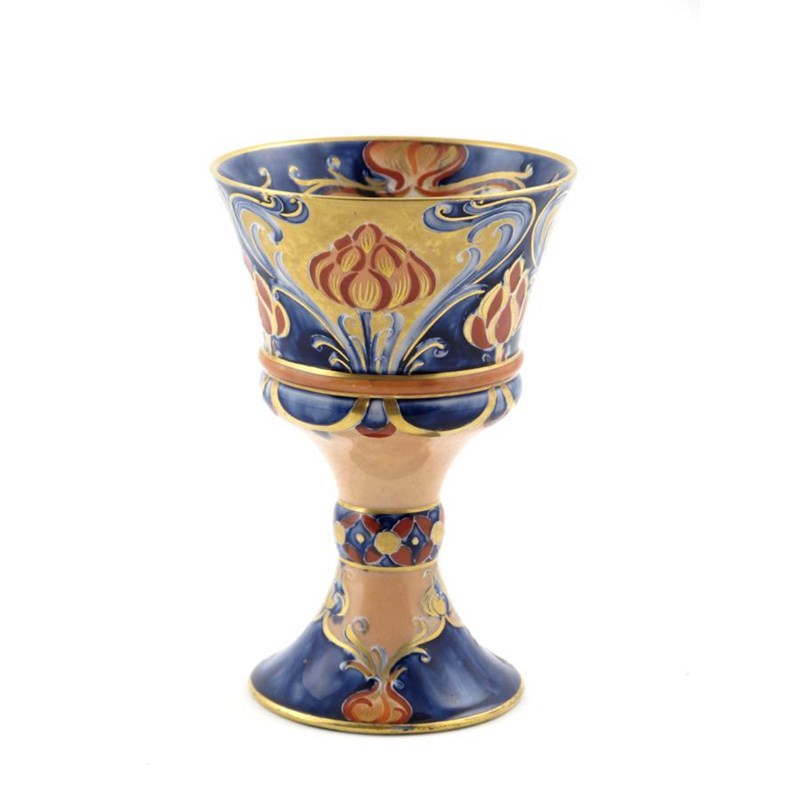 'Alhambra' a James Macintyre coupe, designed by William Moorcroft, painted in shades of blue and coral red on a salmon pink ground, highlighted in gilt printed factory mark, small chip to foot rim 15cm. high