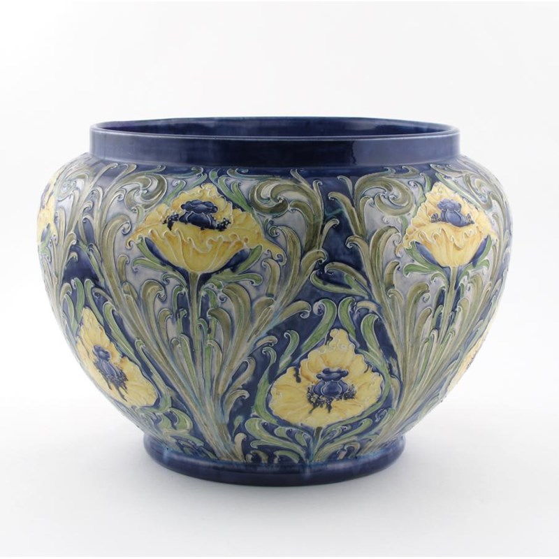 'Poppy' a Large James Macintyre & Co Florian Ware jardiniere, designed by William Moorcroft, painted in shades of yellow, green and blue on a blue ground printed Florian Ware mark, painted green signature 32cm. high