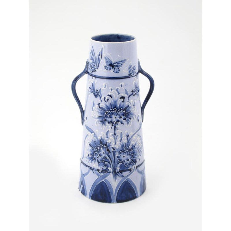 'Cornflower' a James Macintyre & Co Florian Ware twin-handled vase, designed by William Moorcroft, tapering cylindrical form with applied handles, tubelined with cornflowers below a band of butterflies, in blue on a pale blue ground printed factory mark, painted green signature, hairline to top rim, 21cm. high