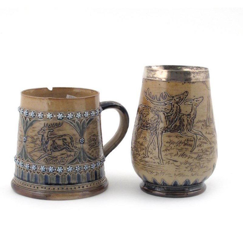 A Doulton Lambeth stoneware tankard by Florence Barlow, dated 1876, incised with a frieze of two deer in a woodland setting, glazed in ochre, with applied silver rim, and another Doulton tankard by Florence Barlow with deer roundel impressed and incised marks, damage to one 14cm. high