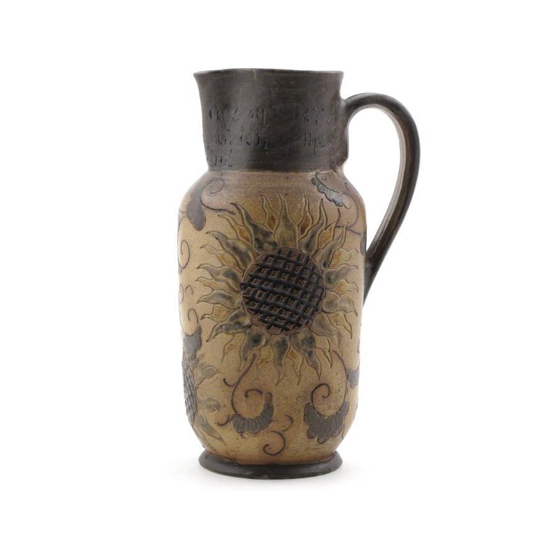 A Martin Brothers stoneware jug, cylindrical form with collar neck, incised with a large Aesthetic Movement sunflower, in shades of ochre and brown on a buff ground, the neck incised with a poem inscription incised 25.3.51 (81) Martin London & Southall, minor professional restoration to top rim, 24cm. high