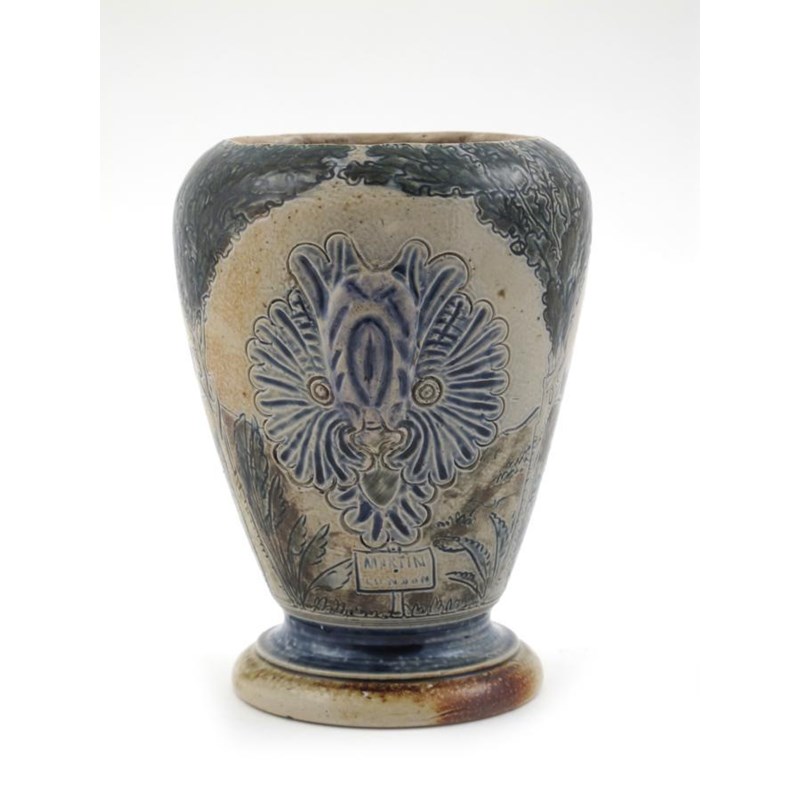An early Martin Brothers stoneware Medieval vase, by Robert Wallace Martin, incised with boys fishing by a river, modelled in low relief with an owl mask, in shades of blue, green and brown incised E.32, R W Martin London 5-1875, professionally restored, 15.5cm. high