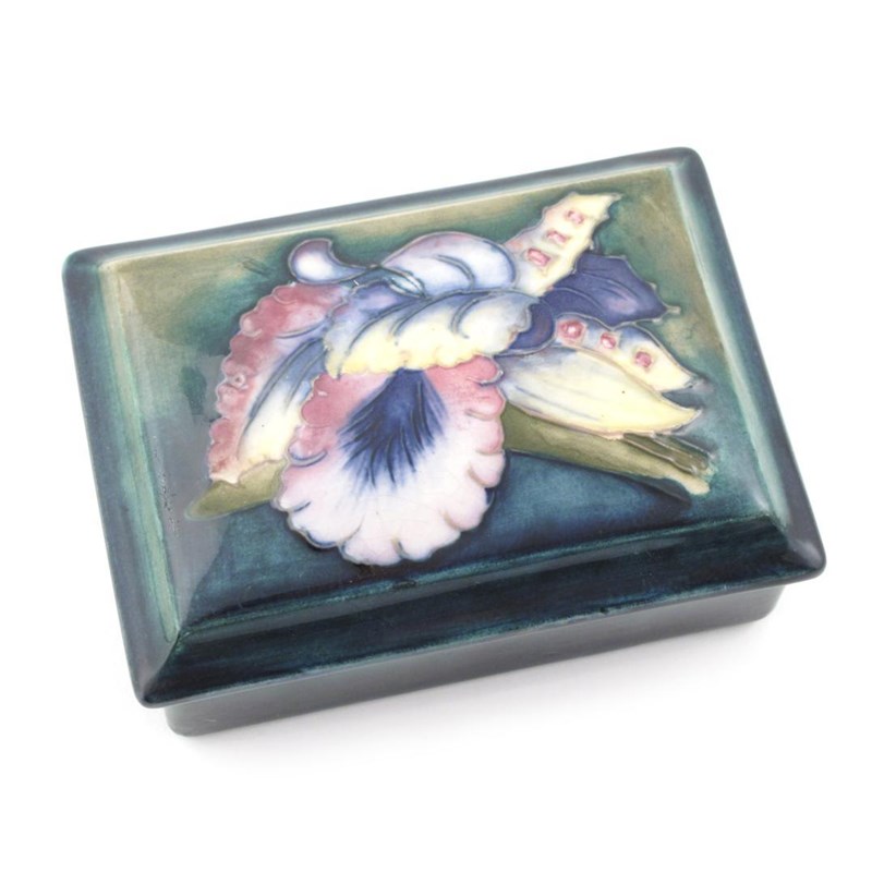 'Orchid' a Moorcroft Pottery box and cover designed by Walter Moorcroft, rectangular section, painted in colours on a blue ground impressed factory marks, 13cm. wide