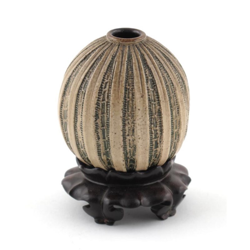 A Martin Brothers stoneware gourd vase, ovoid with vertical incised veins, glazed ochre and green incised 4-1906 Martin Bros London & Southall 6.5cm. high