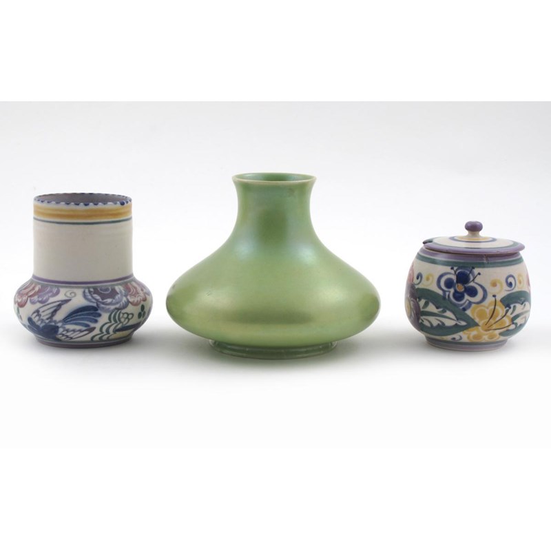 A Moorcroft Pottery vase, designed by William Moorcroft, compressed form with cylindrical neck, covered in a green lustre glaze, and two Poole Pottery items impressed marks 12cm. high