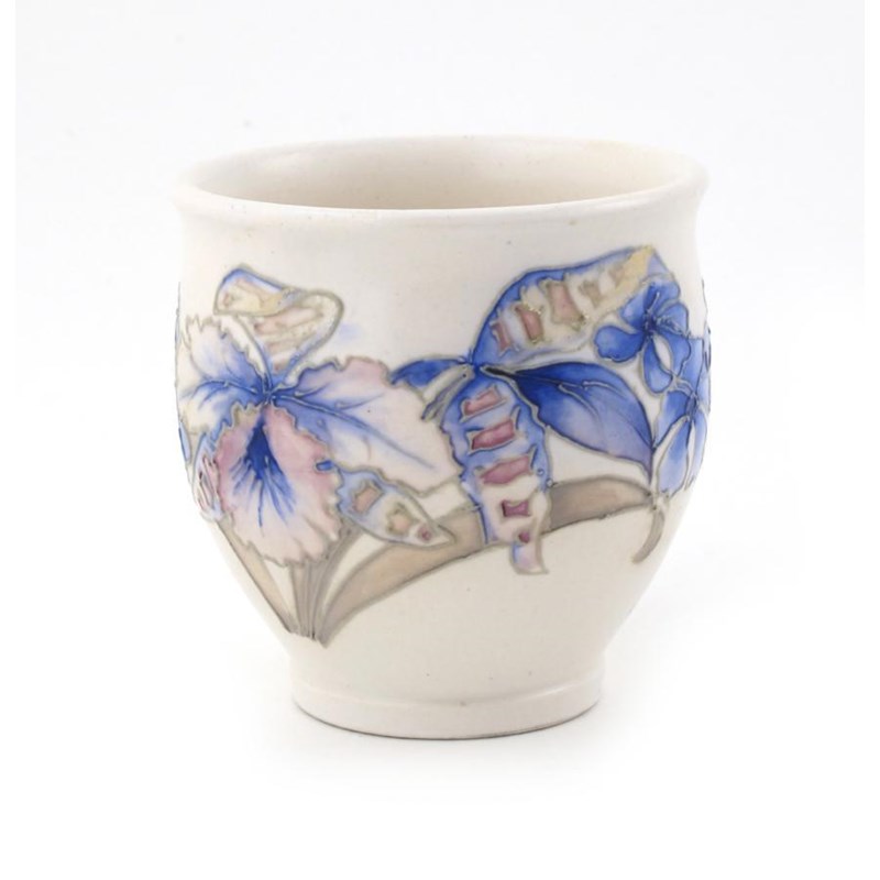 'Orchid' a Moorcroft Pottery salt-glazed vase, designed by William Moorcroft, beaker form, glazed in colours on a white ground impressed marks, painted blue signature 9cm. high