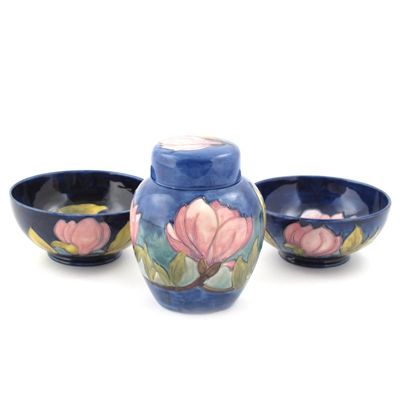 'Magnolia' a Moorcroft Pottery ginger jar and cover, designed by Walter Moorcroft, painted in colours, and two bowls impressed marks, painted green monogram, bruise to rim of cover 17cm. high
