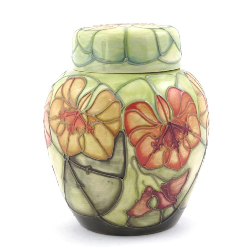 'Nasturtium' a Moorcroft Collector's Club ginger jar and cover, designed by Sally Tuffin, 1992, painted in colours on a pale green ground impressed marks painted green WM monogram 16cm. high
