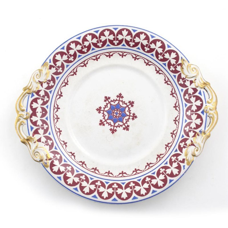A Minton's New Stone twin-handled platter, the design attributed to A W N Pugin, printed to the rim with foliage frieze and central foliate roundel, in puce and blue, highlighted in gilt impressed marks 38cm. wide