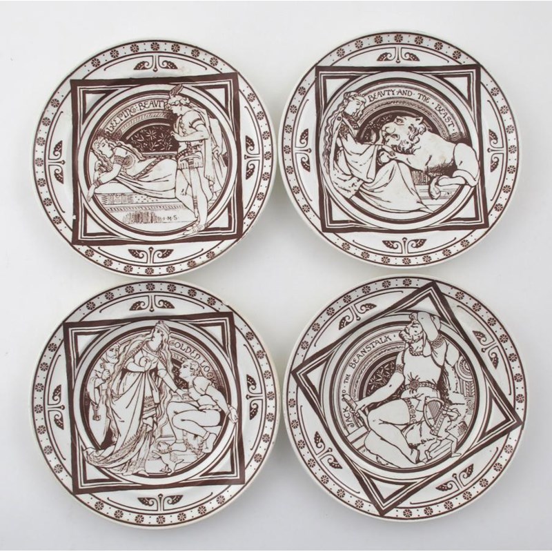 A set of four Minton's plates designed by John Moyr Smith, printed in brown on a white ground, comprising 'Sleeping Beauty', 'Beauty and the Beast', 'Golden Locks' and 'Jack and the Beanstalk' impressed mark, painted monogram to design 21.5cm. diam.