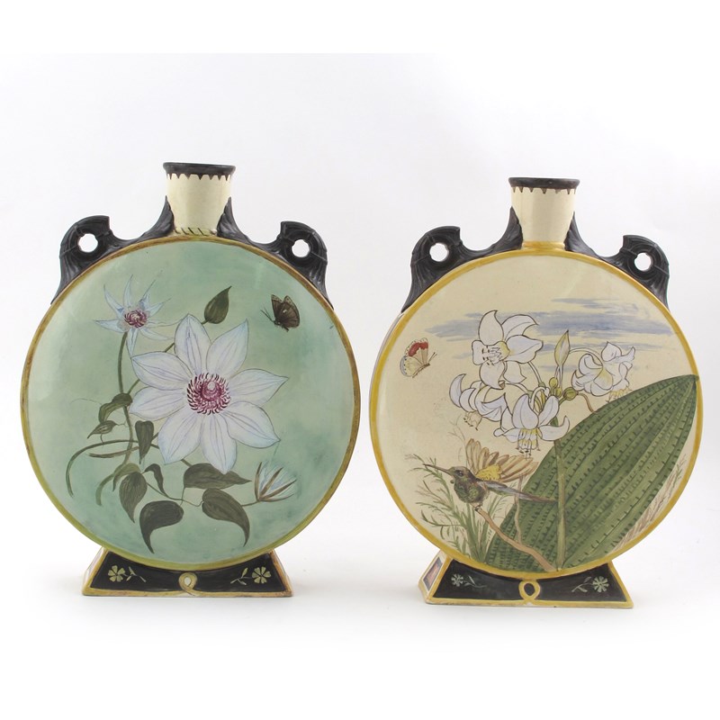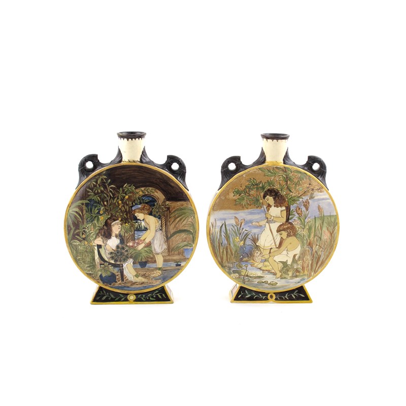 A pair of Minton's Pottery moon flasks, flattened disk form, one painted with young figures fishing, the other with a young figure being served fruit from a tray in a palace setting, the reverse with flowers, in colours impressed marks 34cm. high