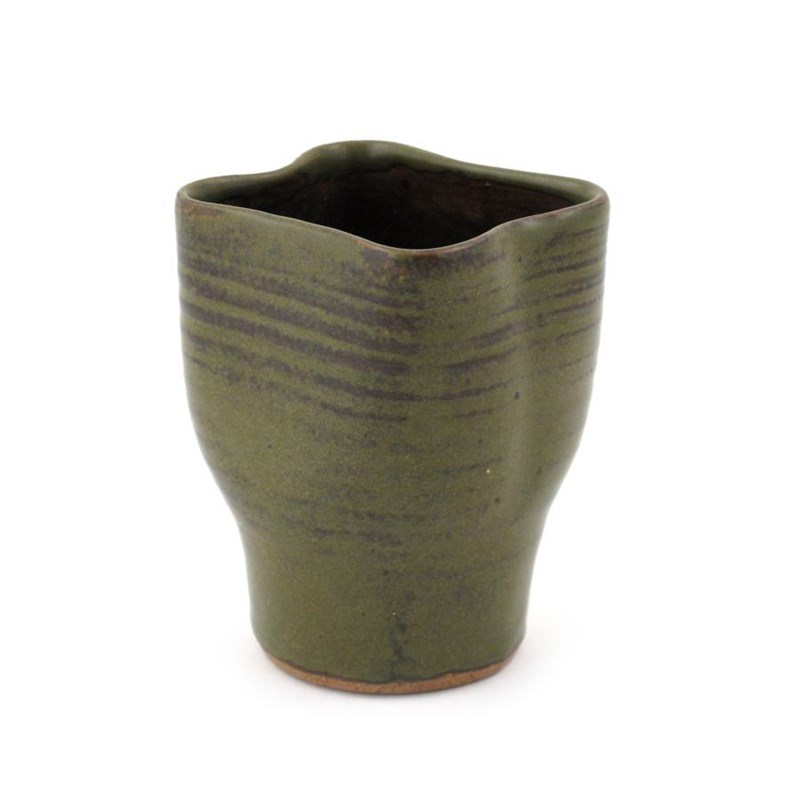 an earthenware vase, flaring form with pinched, squared rim, glazed to the foot in green impressed seal mark 10cm. high