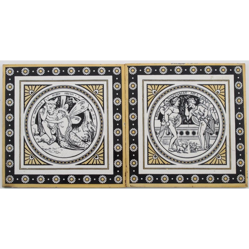 Two large Minton's Shakespeare Series tiles designed by John Moyr Smith, comprising 'Midsummer Night's Dream' and 'Romeo and Juliet' glazed in ochre and black on a white ground, and seven other Minton's tiles designed by John Moyr Smith impressed marks, damages 20.5cm. wide