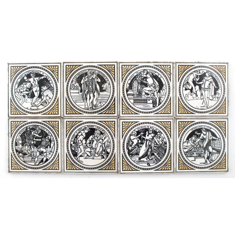 Eight Minton's Shakespeare Series tiles, designed by John Moyr Smith, printed in black and ochre on a white ground impressed marks, damages 15cm. square