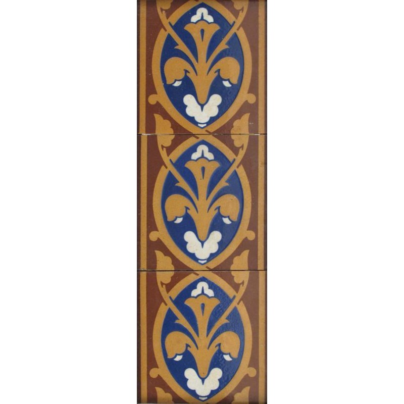Three Maw & Co tiles, designed by J P Seddon, decorated with medieval revival floral repeat in blue, ochre and brown impressed marks, each tile 15.5cm. square