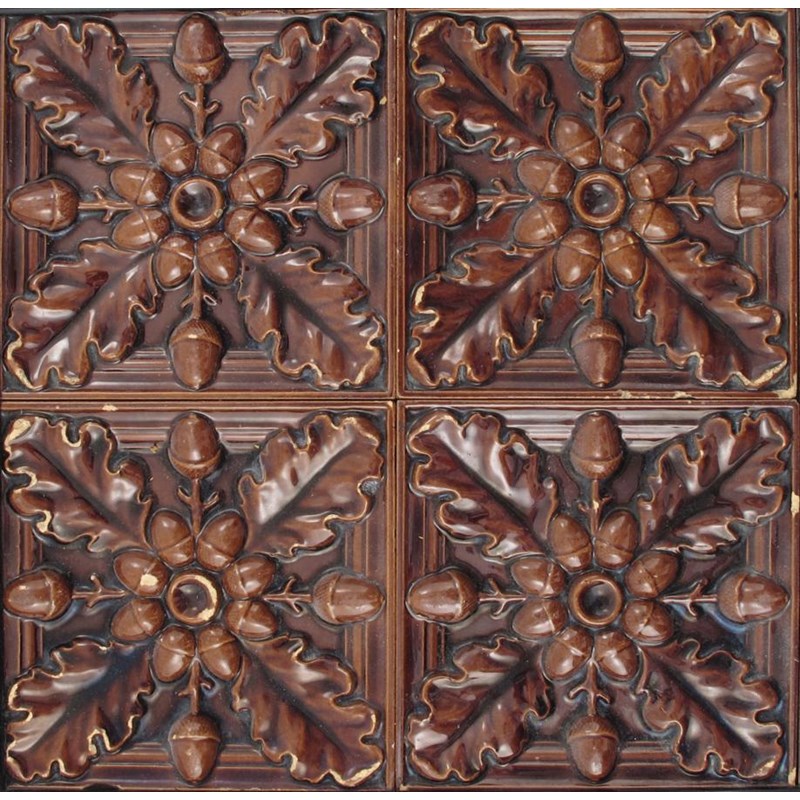 A Maw four tile panel, each tile dust pressed in low relief with acorn and oak leaf radiating design, glazed brown, a Minton's four tile panel, a Minton's Aesthetic tile printed with a flying crane and three other tiles various marks, acorn tile panel 30cm. square