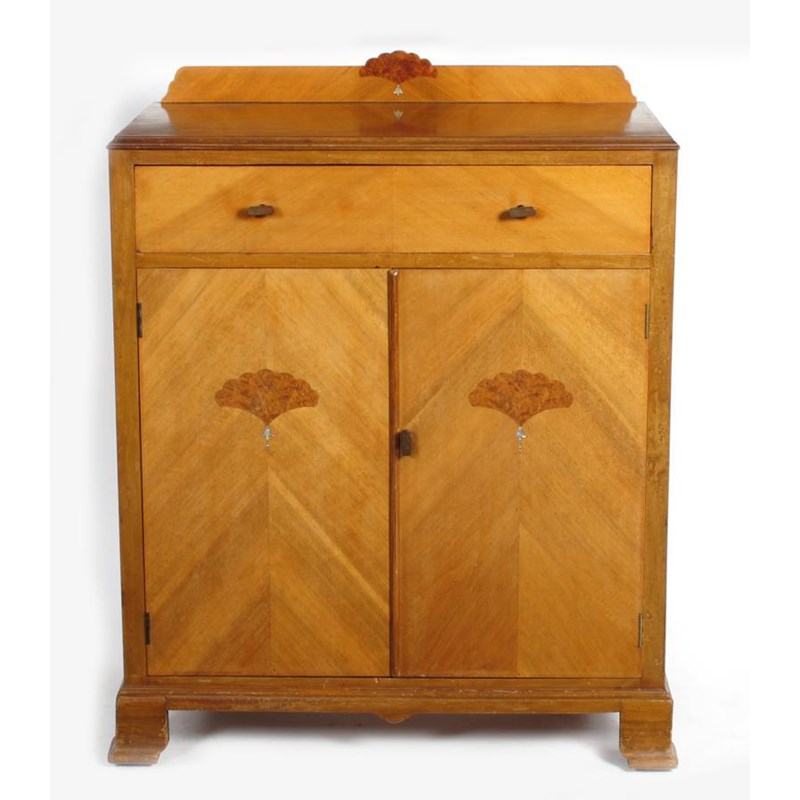 A Bowman Brothers walnut cabinet, with inlaid amboyna and abelone shell flower panels, single drawer above twin, hinged doors, with bakelite handles applied ivorine label to drawer 105cm. high, 83cm. wide