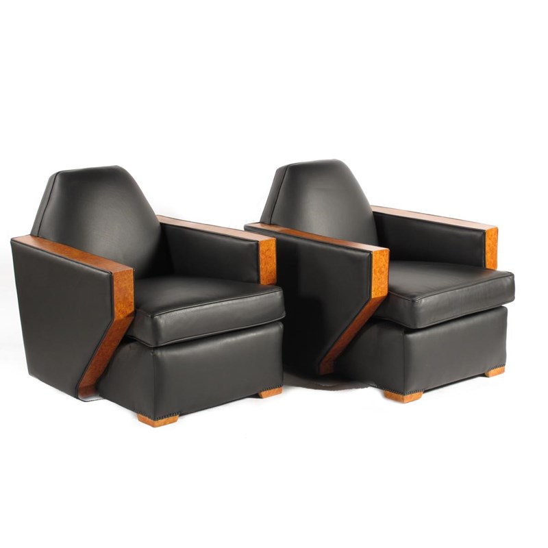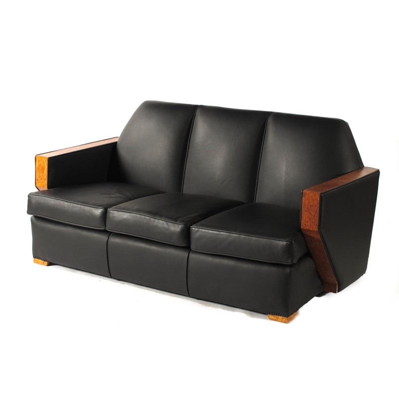 An Epstein Style Art Deco walnut and leather three piece suite, comprising two arm chairs and a three seat sofa, with black leather finish unsigned