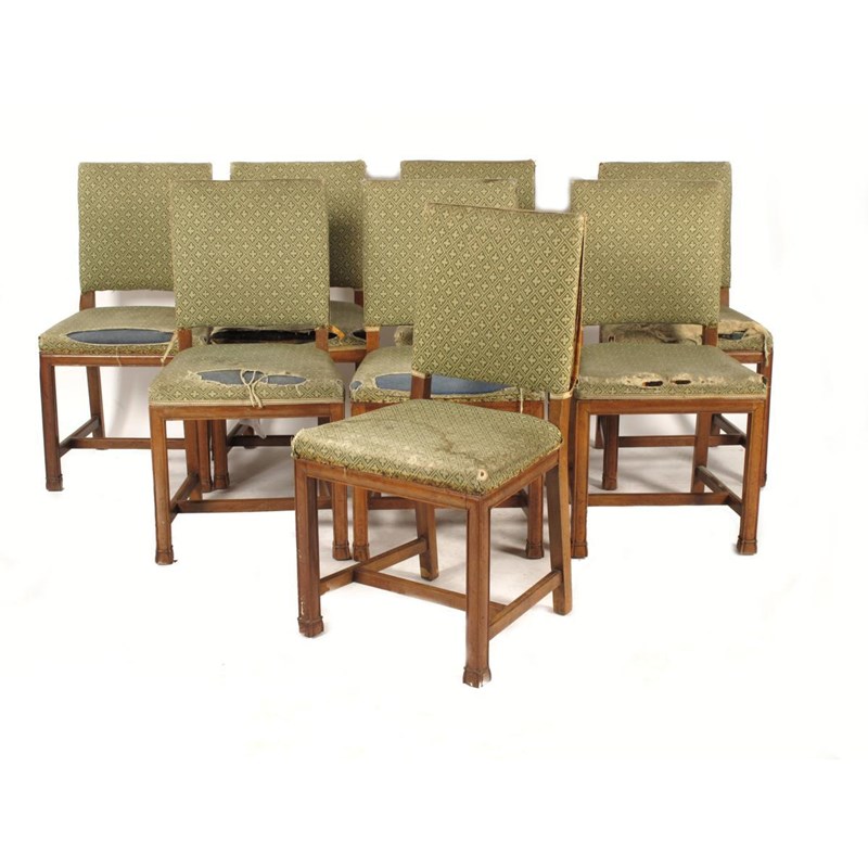 A set of eight Heal's oak dining chairs, with reeded square section legs, inset Heal's button label 92cm. high