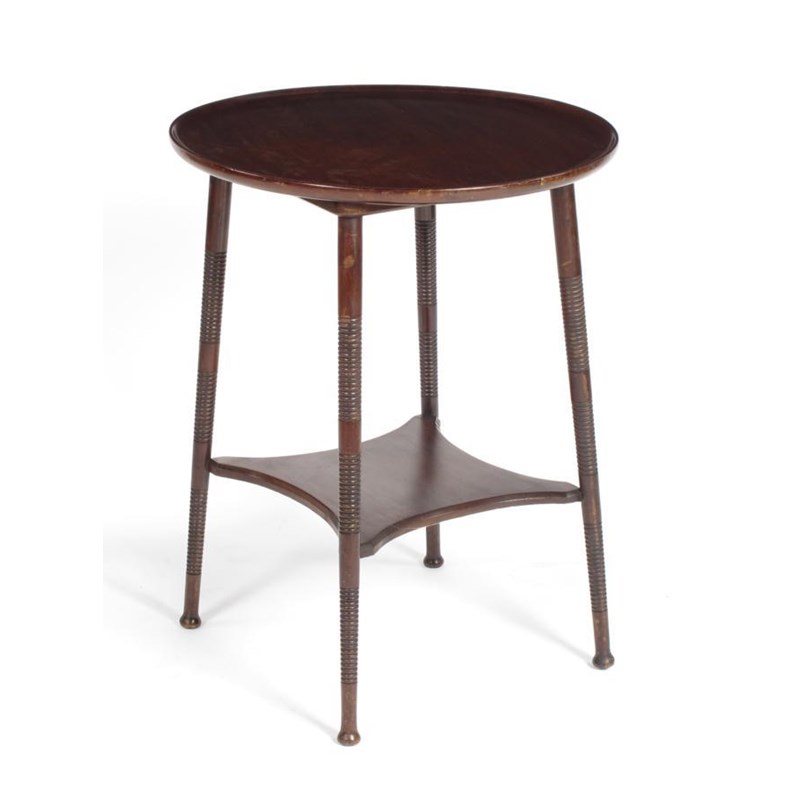 A Liberty & Co mahogany occasional table, circular tray top with turned legs, supporting shaped shelf stamped Liberty & Co 69cm. high