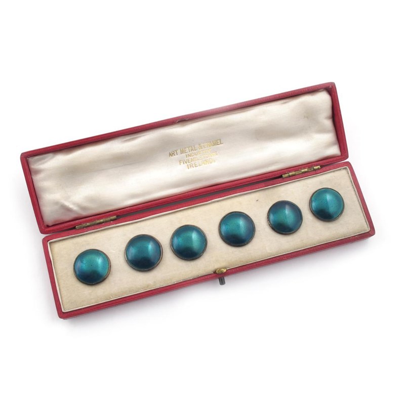A set of Fivemiletown enamelled metal buttons, each circular with green enamel, in fitted case case stamped Art Metal & Enamel Industry Fivemiletown Ireland each button 2cm. diam.